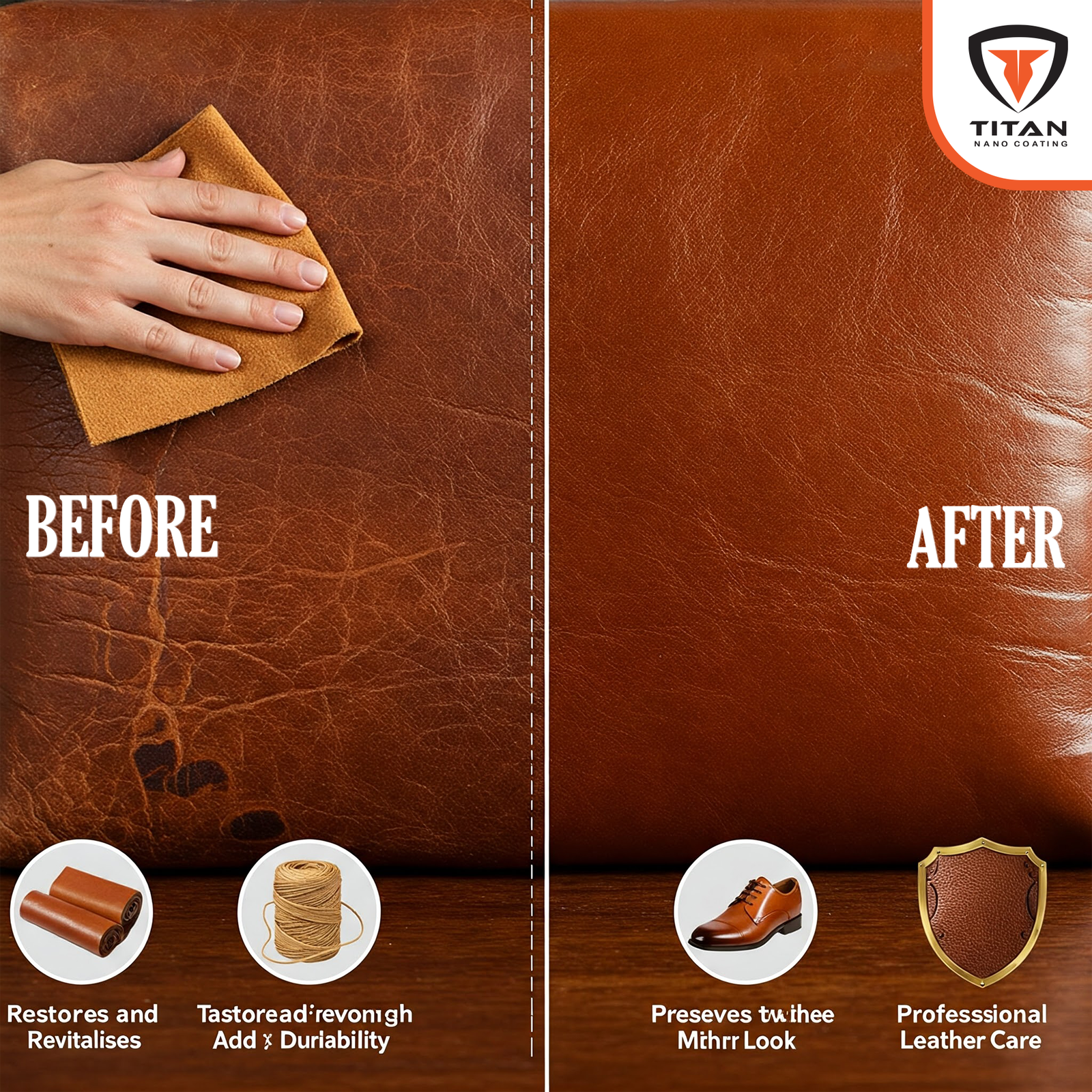 نقدم لك منتج تايتن لحماية الأسطح الجلدية – الحل الأمثل للحفاظ على جميع منتجاتك الجلدية بمظهرها الأصلي، محمية من التلف اليومي. باستخدام تقنية النانو المتقدمة، يخلق بخاخنا حاجزًا غير مرئي يطرد السوائل، الأوساخ، والبقع، ويمنع تلاشي اللون والتشقق الناتج عن العوامل الخارجية. استمتع بجلد ناعم، مرن، ومحمي يدوم طويلاً، مع العلم أن أسطحه محمية بفعالية بفضل طلاء النانو المبتكر من تايتن.