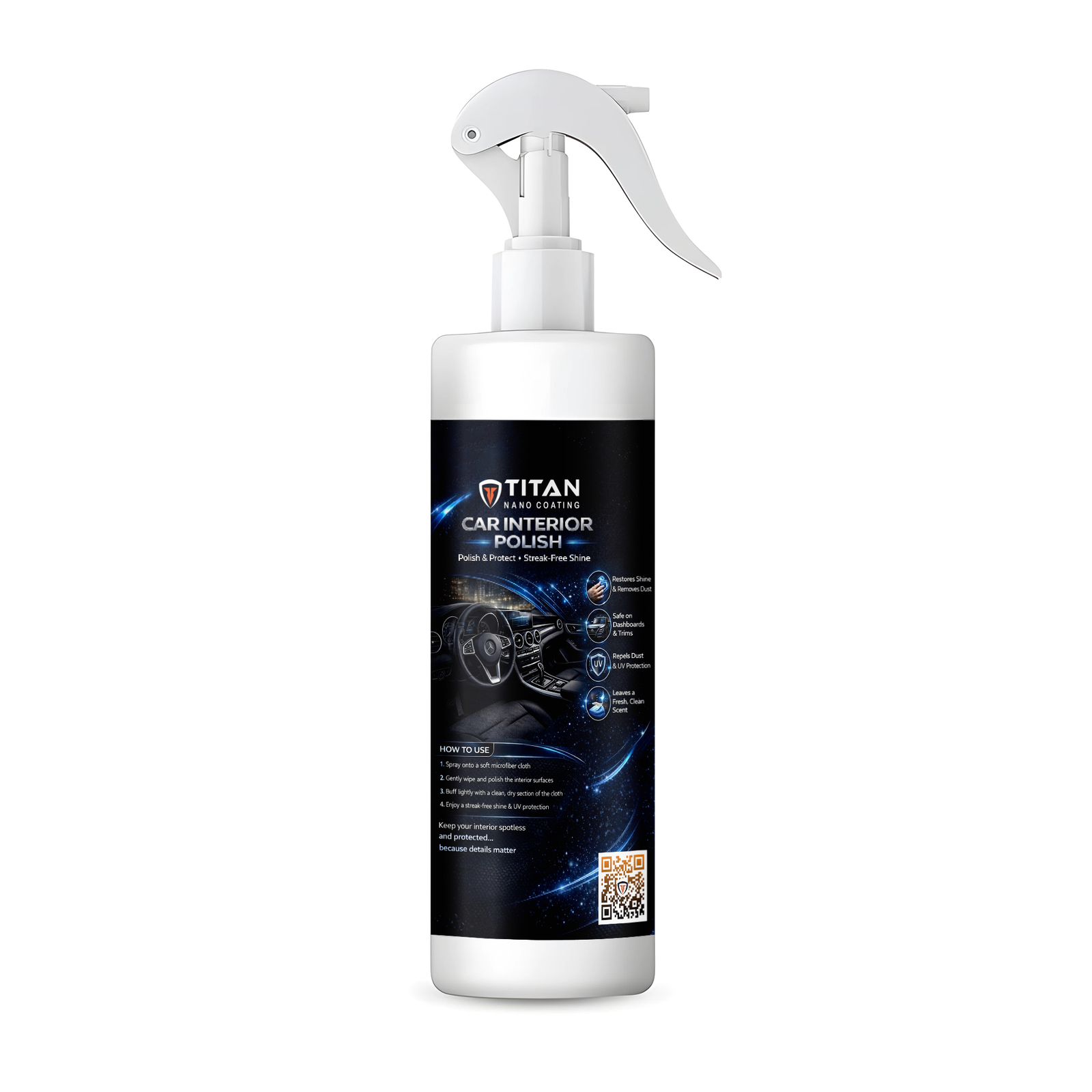 Titan Car Interior Polish is the comprehensive and integrated solution to restore the vitality of your car’s cabin and protect it in a single touch.