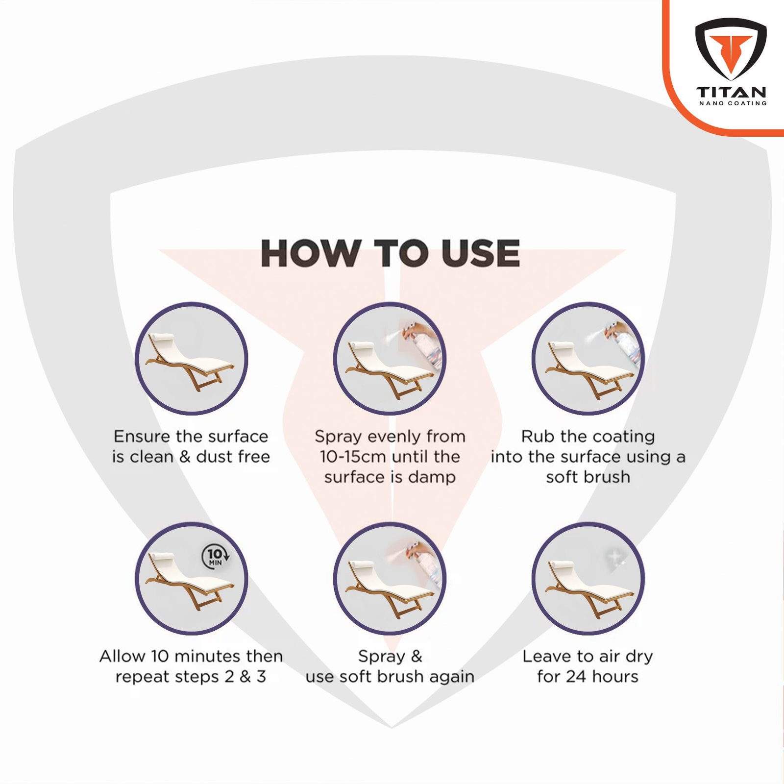 Introducing Titan Marine Fabric Protector – the ultimate solution to keep your boat fabrics, yacht upholstery, and marine gear looking pristine, protected from the harsh marine environment. Utilizing advanced nano-technology, our spray creates an invisible barrier that is highly repellent to water, salt, oils, and stains, while protecting against UV fading, mold, and algae growth. Enjoy clean, protected, and easy-to-maintain marine fabrics that last, knowing your marine investment is effectively shielded by Titan’s innovative nano-coating.